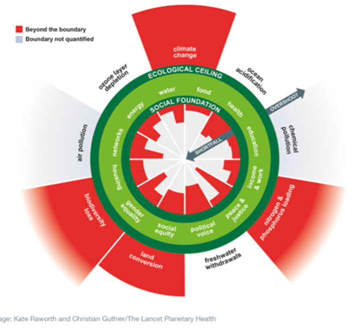 For one of us, this is an eco-socialist economy; based ensuring the economy is within the ‘safe and just space’ of the planetary boundaries and ensuring that no one falls below the ‘social floor’ of making sure everyone’s basic needs for a decent standard of living are met.  This idea has been nicely expressed by green economist Kate Raworth in her ‘doughnut economy’ model (see below).  This shows that of the nine planetary boundaries, under capitalism we have transgressed 4 of them, while at the same time millions of people within our society and around the world fall below the threshold to meet their basic human needs.